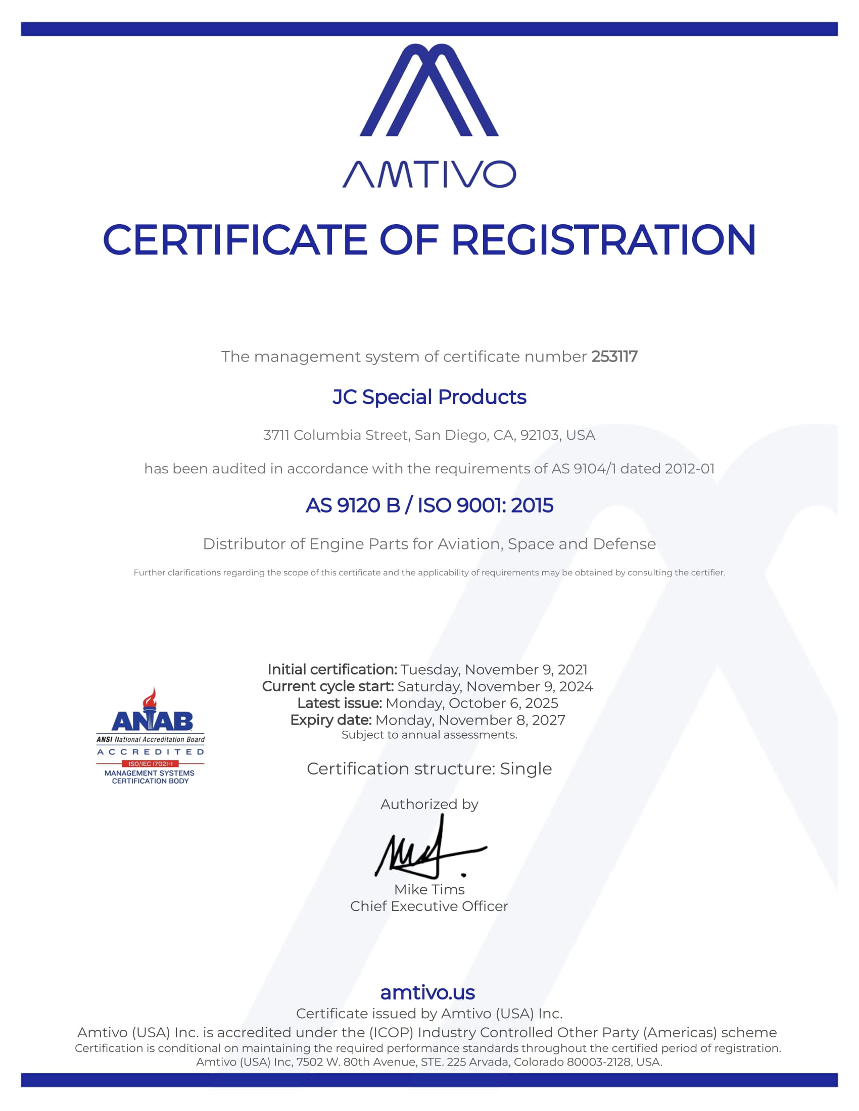 - JCSP is AS9120 B Certified distributor. This means that JCSP has been audited and accredited by Amtivo, ensuring that our quality standards are in line with the International Aerospace Quality Group (IAQG).